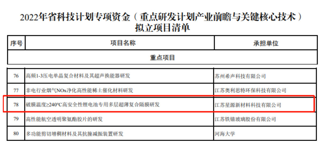 5月23日,江苏省科技厅公示了2022年省科技计划专项资金(重点研发计划产业前瞻与关键核心技术)拟立项目,taptap点点官方网站全资子公司江苏taptap点点官方网站的“破膜温度≥240℃高安全性锂电池专用多层超薄复合隔膜研发”项目位列其中!